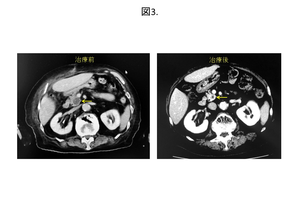 ●膵癌85歳女性:ご高齢で手術や抗癌剤治療が困難なため、サイバーナイフで通院治療を行いました。照射後1年半が経過し、癌は小さくなりそのまま大きくなりません。他の場所への転移もなく、とても元気に生活されています(図3)。