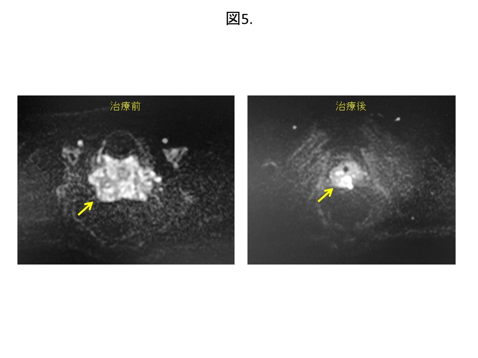 ●前立腺癌83歳男性:比較的進行した前立腺癌の症例です。手術および化学療法の希望がなく、できるだけ体に負担の少ない治療を希望されサイバーナイフを施行しました。治療後ホルモン療法も併用し、腫瘍は徐々に縮小してその状態を維持しています(図5)。