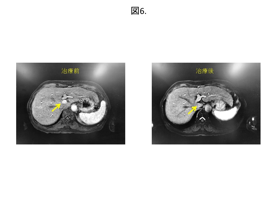 ●肝細胞癌78歳女性:肝臓のS1と呼ばれる標準治療(手術・ラジオ波焼灼療法)が難しい場所に肝細胞癌を発症しました。当初は高難度の手術を受ける予定でしたが、体への負担が少なく安全に治療可能なサイバーナイフを選択されました。治療後、肝細胞癌は消失しました(図6)。治療から5年以上再発なく経過しています。