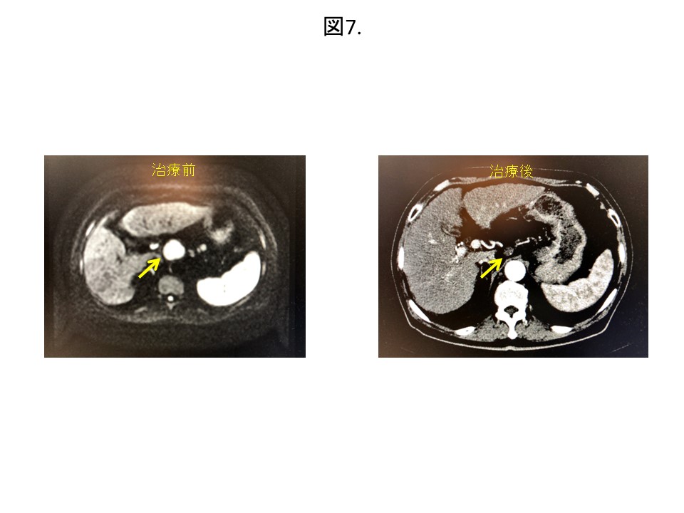 ●肝細胞癌65歳男性:肝細胞癌治療後の患者さんです。腹腔内のリンパ節に再発認めました。通常、リンパ節再発のような遠隔転移の場合は、例えその数が1つであっても標準治療は抗癌剤投与となります。しかしながら、この患者さんは心臓の病気と維持透析をされている関係で、まずはサイバーナイフ治療を行うこととしました。幸いなことに治療後、リンパ節転移は消失して(図7)、その後5年以上再発を認めていません。