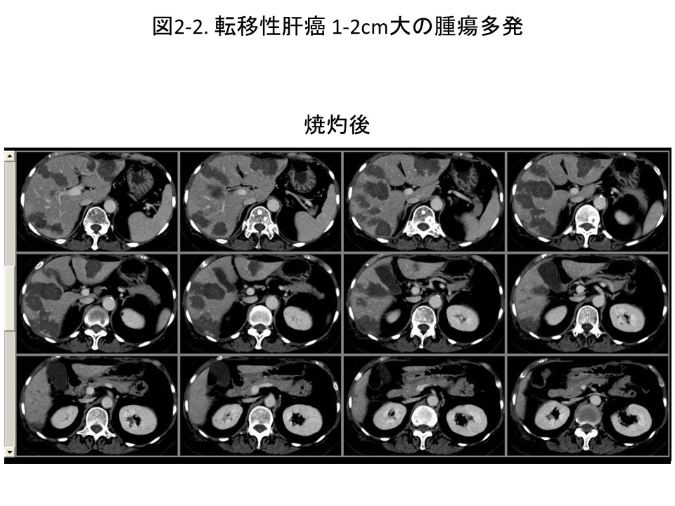 転移性肝癌とは、肝臓以外の臓器にできた癌(原発巣)が肝臓に転移したものを指します。ほぼすべての癌種において、肝臓へ転移する可能性がありますが、実際には消化器系の癌(大腸がん、胃がん、膵がん、胆のうがんなど、)乳癌、肺癌、婦人科系の癌、腎癌などが肝臓への転移を認めることが多いと報告されています。当院ではそのような転移性肝癌についても、積極的に無痛RFAを行っています。転移性肝癌は肝硬変を合併していないため、より大きな、そして、たくさんの腫瘍を焼灼することが可能です(図1-2)。しかし、転移性肝癌に対する無痛RFAはまだ歴史が浅く、外科的手術、抗がん剤治療、無痛RFAのいずれが最良なのか結論がでておりません。転移性肝癌の治療に関しては、無痛RFAのみに固執せず、必要とあれば、抗がん剤治療、放射線治療等をうまく組み合わせて、患者さんがより元気に長生きできるよう努めております。肝内の腫瘍量減退が予後延長に結びつくと予想される場合は、積極的に集学的治療の一環として、無痛RFAをおこなっています。 (全身状態に実施不可能な場合もあります。)そのため、明確な腫瘍の大きさ、腫瘍の個数の制限を設けていません。お手数ですが、ご自身の転移性肝癌の状態が無痛RFAの適応かどうか、個別に外来に受診していただきご相談いただければ幸いです。大まかな目安としては、最大径5cmの場合は3個程度まで、最大径2cmの場合は10個程度までとなります。