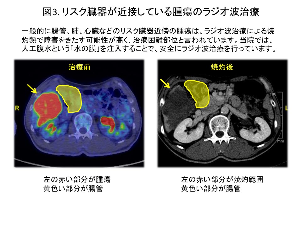 当院では転移性肝癌に対して、積極的に無痛RFAを行っています。強固なエビデンスに欠ける治療であることは十分に認識しております。転移性肝癌は、転移である以上、全身の疾患であり、各癌種に応じた化学療法が治療の根幹であると考えます。また一部の癌種によっては、外科的な手術が推奨される場合もあります。私たちがこのような治療を行っているのは、標準治療で選択できるものが無くなってしまった、様々な背景により標準治療を受けることができない、そのような患者さんに少しでも元気で長生きできる時間を作るお手伝いができればと思っているからです。転移性肝癌に対するラジオ波焼灼療法は、当院の倫理委員会で正式に承認されており、前任地においてRAFAEL studyとしてUMINに登録されております(UMIN000020250)。これまでの経験は、随時学会・論文等の科学的形式で公表しております。